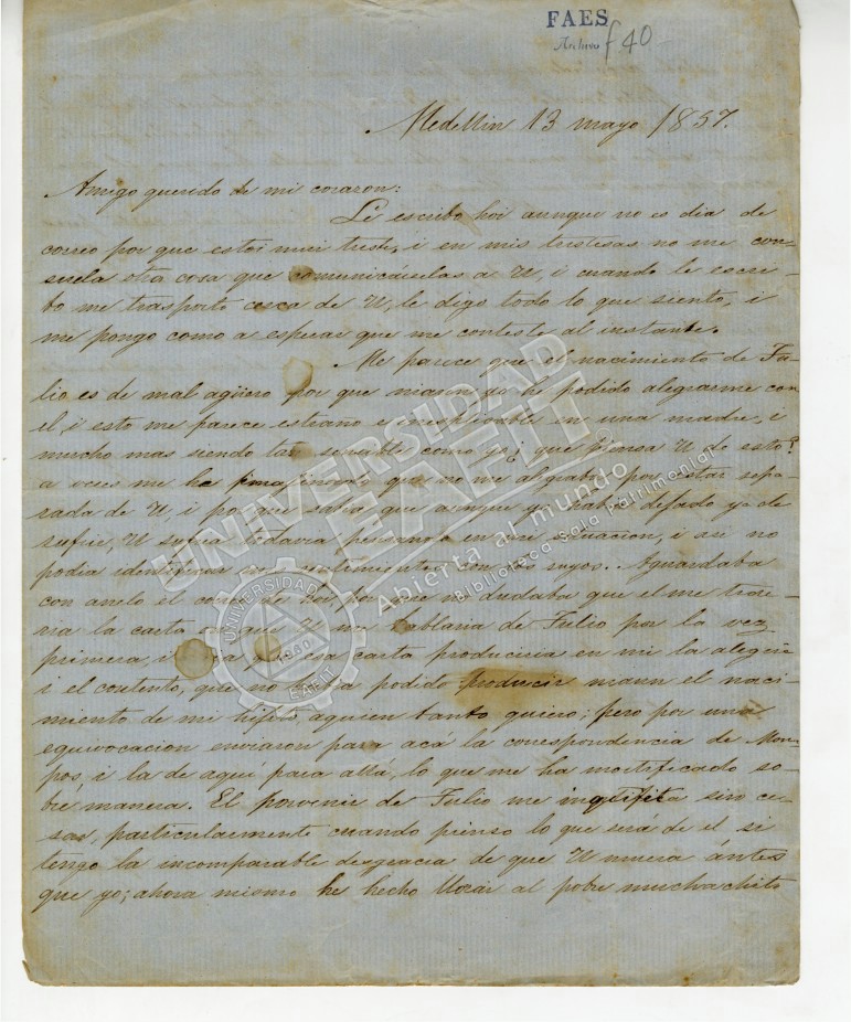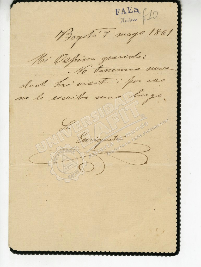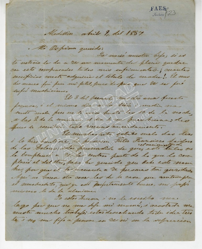 ver | CorColombia-0006 | 1857 | Medellín | Carta de Enriqueta Vásquez de Ospina a su esposo Mariano Ospina Rodríguez en la que le comparte su tristeza y le transmite que aún no ha podido alegrarse por el nacimiento de su hijo Tulio. | EAFIT | ![]() |
