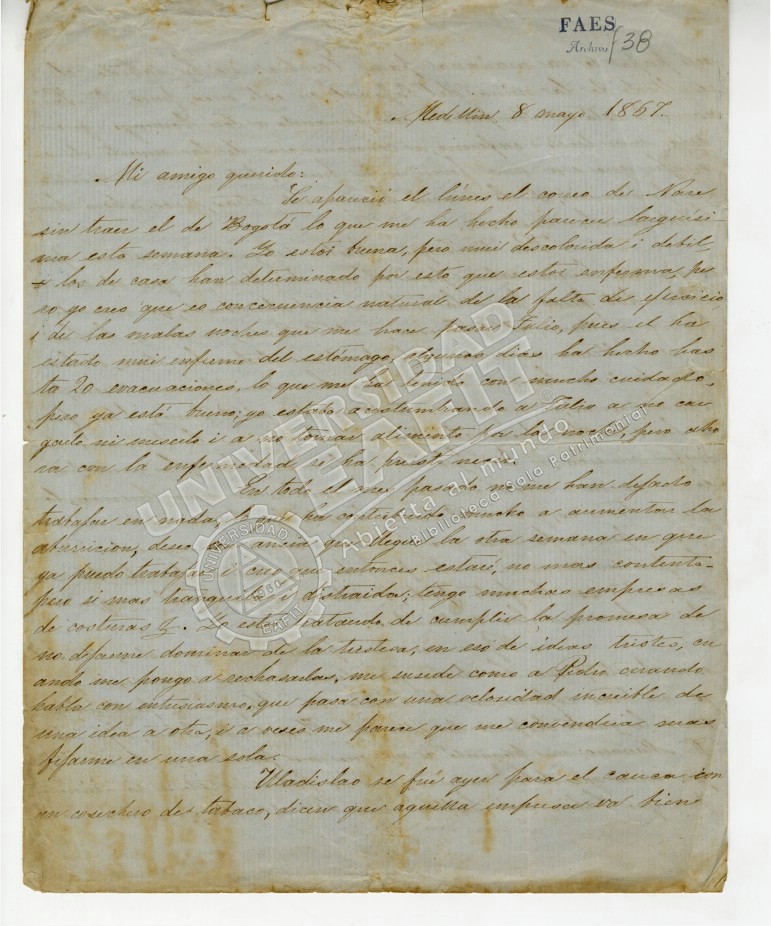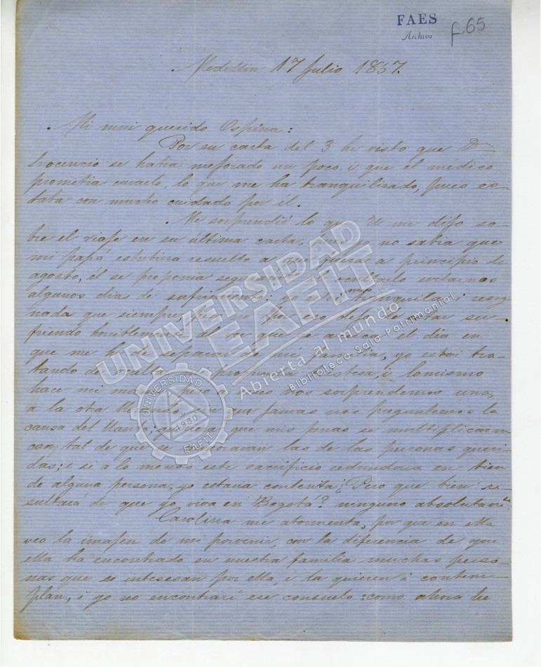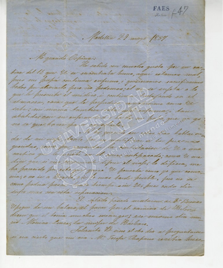 ver | CorColombia-0005 | 1857 | Medellín | Carta de Enriqueta Vásquez de Ospina a su esposo Mariano Ospina Rodríguez en la que le informa de su salud y la de su hijo Tulio, y le comenta las visitas que ha recibido y sus planes de viajar a Bogotá. | EAFIT | ![]() |