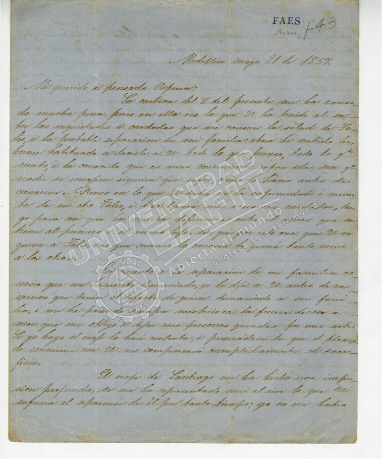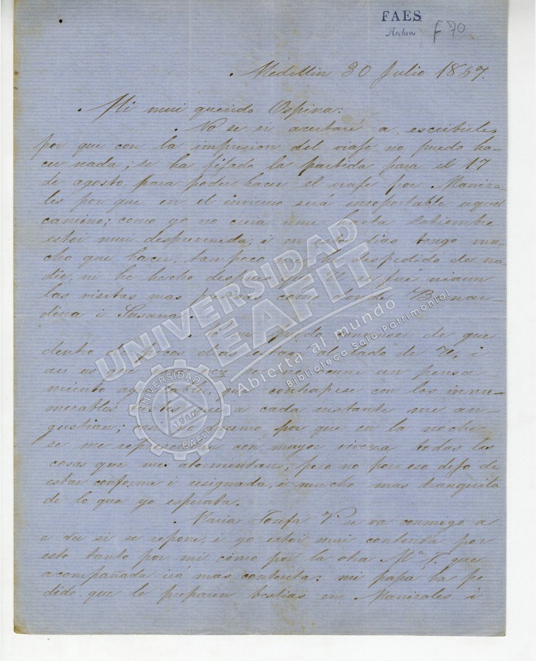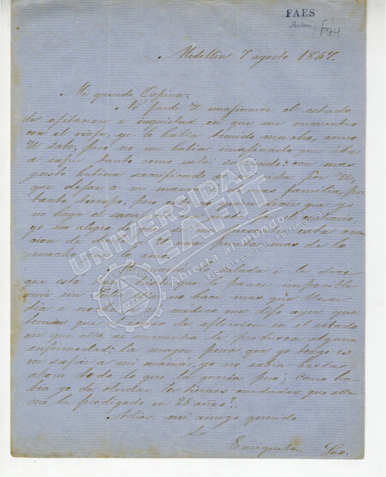 ver | CorColombia-0007 | 1857 | Medellín | Carta de Enriqueta Vásquez de Ospina a su esposo Mariano Ospina Rodríguez en la que le habla de lo doloroso que será separarse de su familia y el amor que siente por los hijos de Mariano. | EAFIT | ![]() |