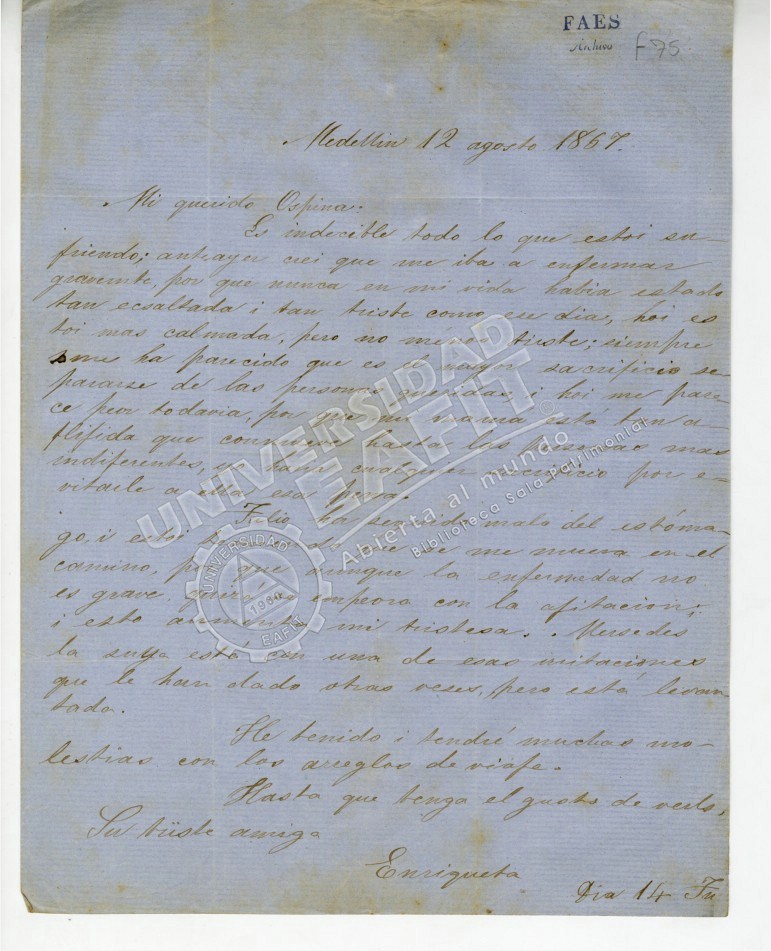 ver | CorColombia-0012 | 1857 | Medellín | Carta de Enriqueta Vásquez de Ospina a su esposo Mariano Ospina donde le habla de su sufrimiento por separarse de su madre y del temor de que su hijo Tulio se muera en el camino. | EAFIT | ![]() |